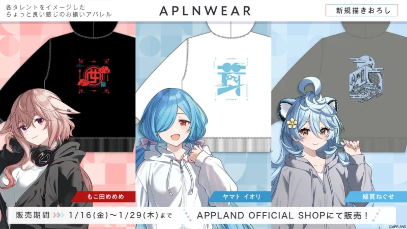 ✅カジュアルでおしゃれなパーカーが販売! ✅もこ田めめめ、ヤマト イオリ、綿貫ねぐせをイメージした可愛いグッズも! ✅購入はAPPLAND OFFICIAL SHOPで1月16日から!