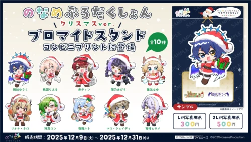 株式会社サムライソードが発表したのは、のなめぷろだくしょん所属VTuberたちのクリスマス衣装ブロマイドスタンドの販売だ!12月9日から31日まで、全国のコンビニ店内マルチコピー機で購入できるよ。このブロマイドスタンドは好きなデザインを選んでプリントできるから、推しを選ぶ楽しさもあるんだわ。L判が300円、2L判が500円という手ごろな価格で、クリスマスの思い出としてぜひ買っておきたい一品だよね!