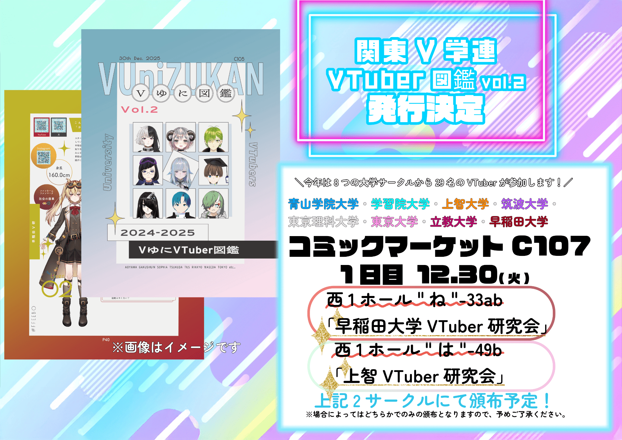 関東VTuber学連がついにコラボ誌「VゆにVTuber図鑑」Vol.2を発売することが決定したみたいって話!この合同誌は、Vゆにに所属する8大学のサークルのVTuberを一堂に紹介する超ボリューミーなものなんだわ!頒布は12月30日、そう、コミケ107の時だよ!価格が驚愕の1000円ということで、ファンなら絶対に手に入れないとヤバイよね。そして、頒布は早稲田大学VTuber研究会と上智VTuber研究会のブースで行われるとのこと。