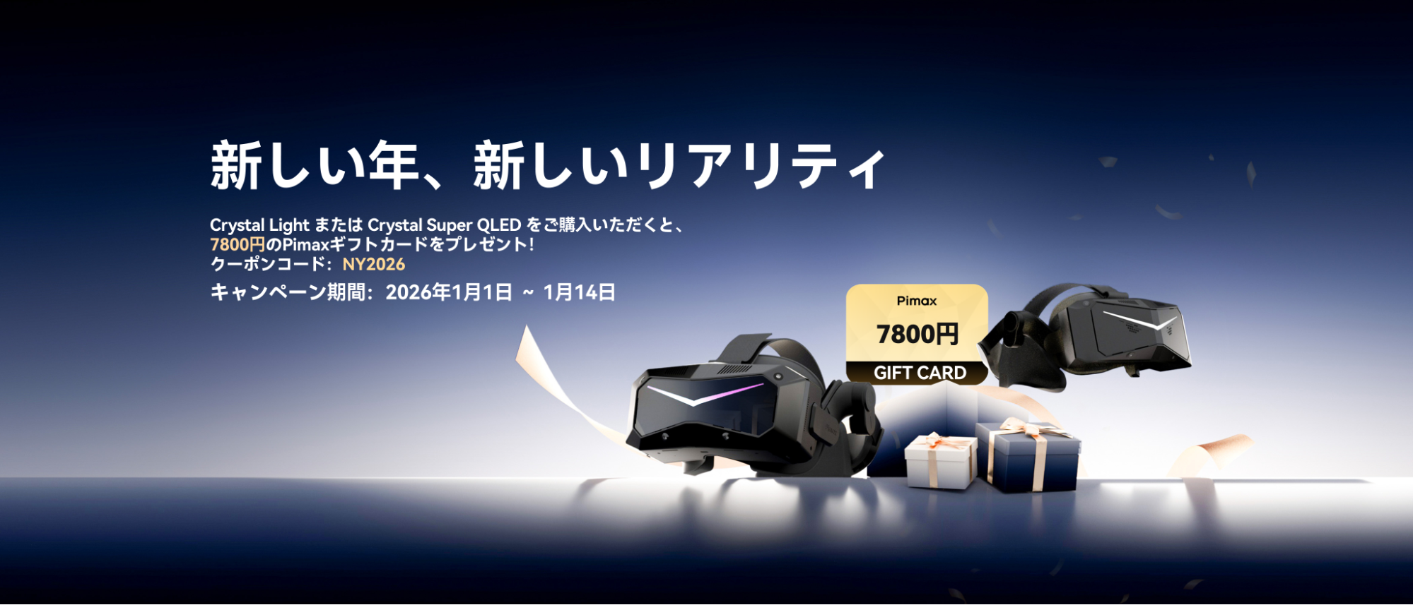 Pimaxが1月1日から1月14日まで初売りキャンペーンを開催中なんだわ!ここでまず注目なのは、クーポンコード「NY2026」を使うことで7800円のギフトカードがもらえるってこと!これがあれば、冬のゲーミング環境がグンと盛り上がるのは間違いなしだよね!それに、このキャンペーンは特にCrystal LightやCrystal Super QLEDを狙ってる人には超朗報なんだわ~。